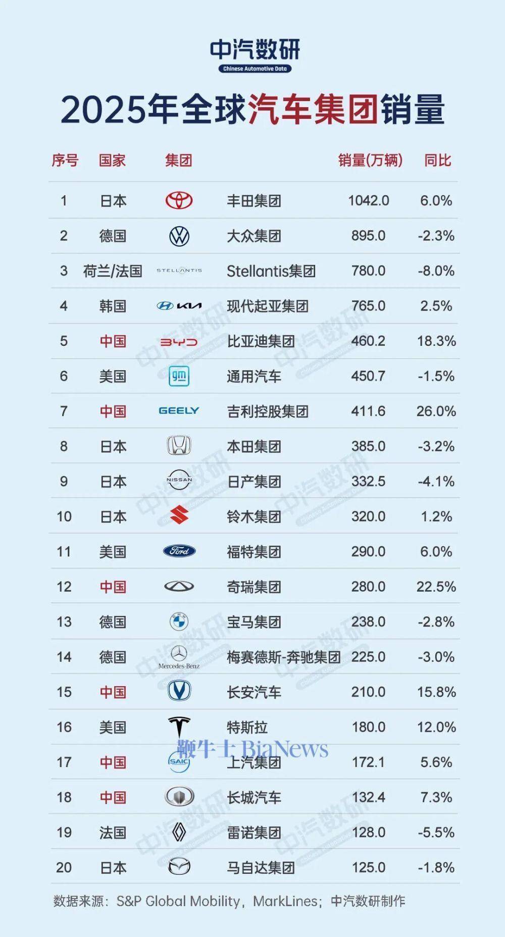 2月7日,中汽数研今日发布2025年全球汽车集团销量TOP20。